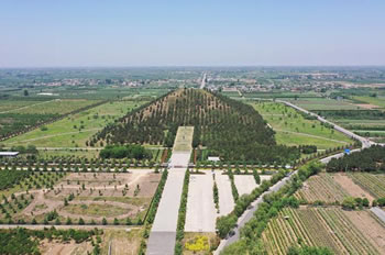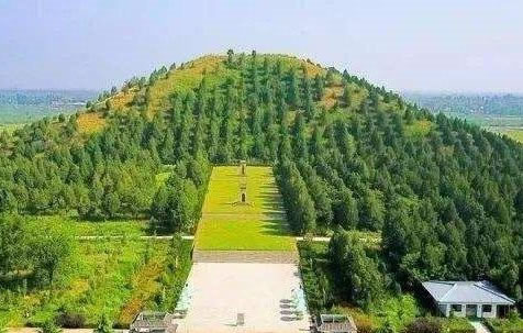 上述與今測量數(shù)字基本相符?傉嫉孛娣e計(jì)為56878.25平方米,封土體積848592.92立方米。陵園四周呈方形,平頂,上小下大,形如覆斗,顯得莊嚴(yán)穩(wěn)重。