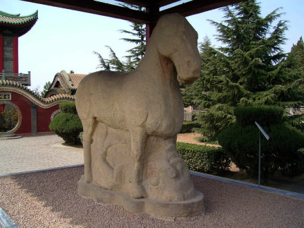 1981年5月在平陽公主墓南,西吳鄉(xiāng)竇馬村農(nóng)民在平整土地時(shí)發(fā)現(xiàn)這件文物。高62厘米,長76厘米,通體銅鑄鎏金,昂首,翹尾,四腿直立,體態(tài)矯健。頭部造型甚為生動(dòng),粉鼻亮眼,兩耳豎立。史書記載其為“金馬”,系以西漢時(shí)大宛國的汗血馬為原型而精制的工藝品。這件國寶,現(xiàn)收藏在茂陵博物館。