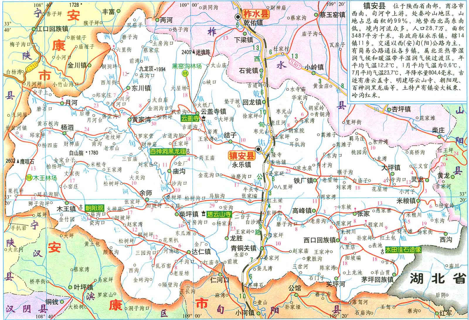 鎮(zhèn)安縣位于秦嶺東段南麓, 位于北緯33.8'至33.48"57',東經(jīng)108 34"35'至109 36"51'。距陜西省西安市195公里,離商洛市178公里。面積3487平方公里。縣委、縣政府駐地永樂鎮(zhèn)(謝家彎)縣城前街188號(hào)。境內(nèi)最高點(diǎn)為楊泅鄉(xiāng)鷹嘴石,海撥2601.6米,最低點(diǎn)是龍勝鄉(xiāng)詢河村河谷,海撥344米,高低落差2257.6米,地勢(shì)西北向東南傾斜;屬長(zhǎng)江水系漢江支流;年均降雨量804.4毫米,年平均氣溫12.2℃,屬亞熱帶半濕潤(rùn)氣候。
