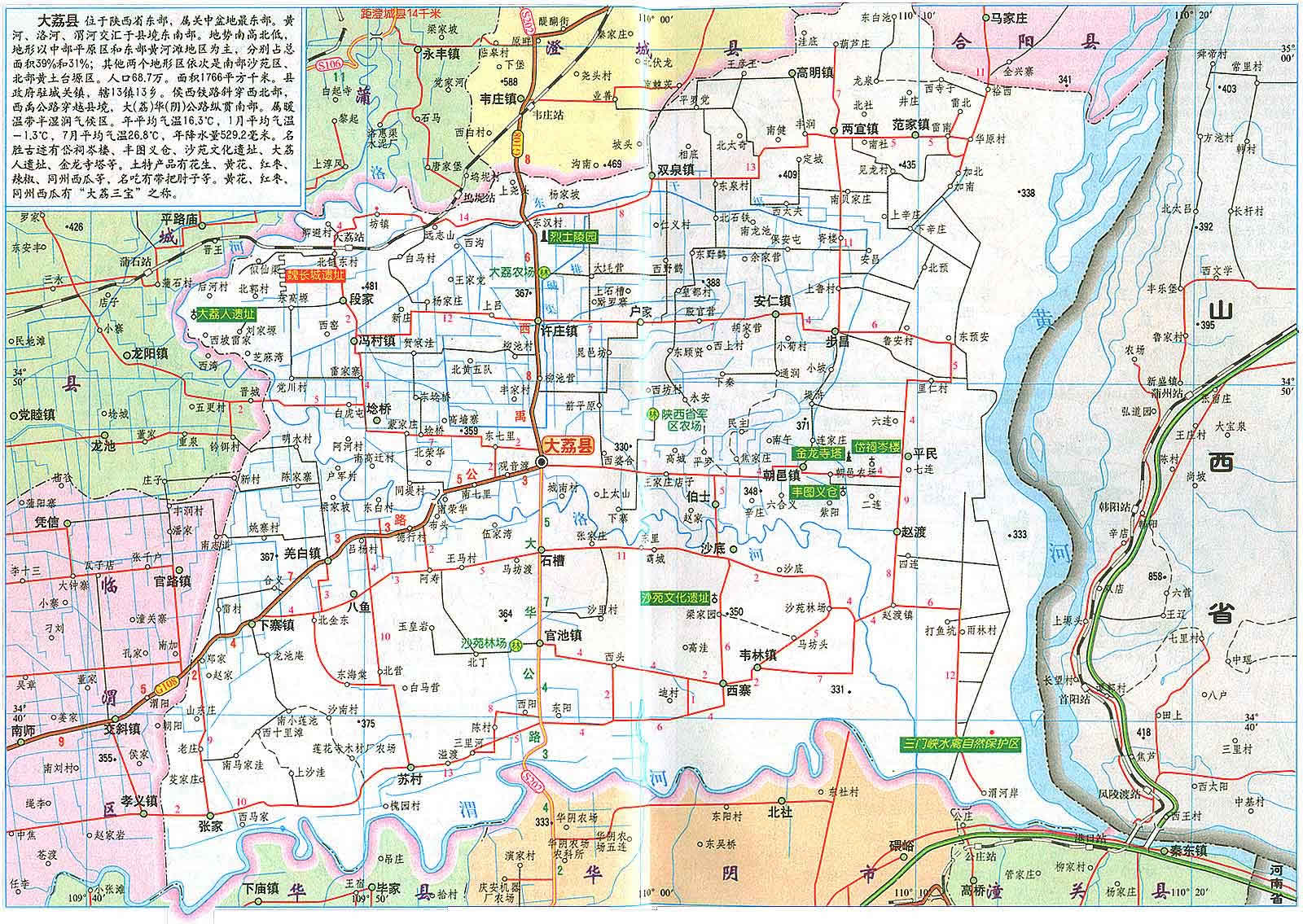 大荔縣位于關(guān)中平原東部,是黃 、洛、渭三河匯流之地。南界渭河與潼關(guān)、華陰、華縣為鄰,西繞洛河與蒲城、臨渭區(qū)毗連,北沿臺塬與澄城、合陽縣接壤,東瀕黃河與山西永濟相望,素有"三秦通衢"、"三輔重鎮(zhèn)"之稱。大荔縣總面積為1776.1平方公里,全縣轄7鎮(zhèn)26鄉(xiāng),414個行政村。總?cè)丝?2萬人。