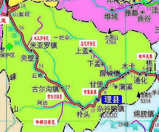 鎮(zhèn):雜谷腦鎮(zhèn)、米亞羅鎮(zhèn)、薛城鎮(zhèn)、古爾溝鎮(zhèn)