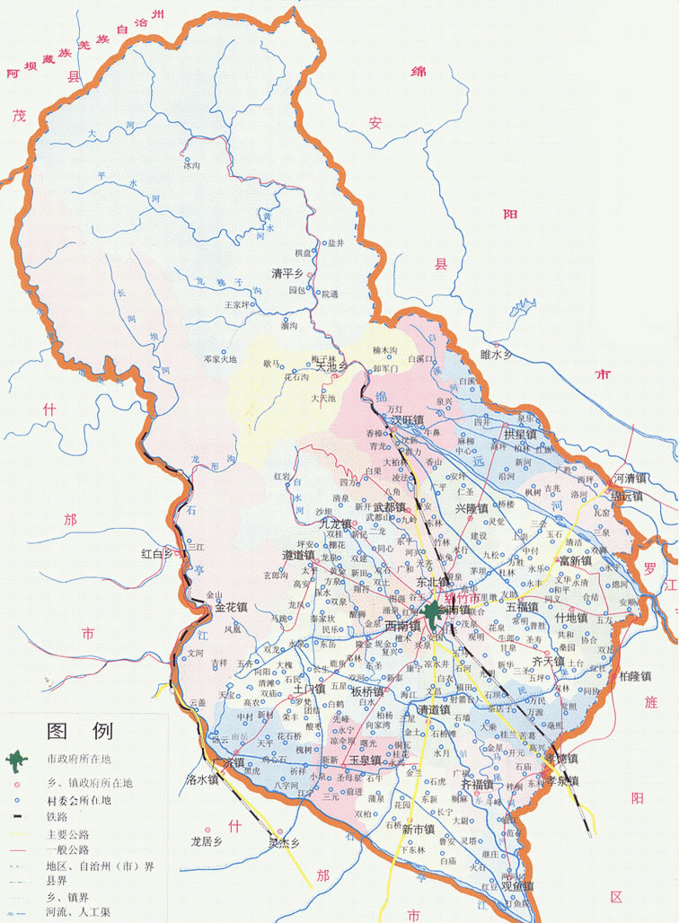 鎮(zhèn):劍南鎮(zhèn)、玉泉鎮(zhèn)、什地鎮(zhèn)富新鎮(zhèn)、孝德鎮(zhèn)、新市鎮(zhèn)板橋鎮(zhèn)、興隆鎮(zhèn)、金花鎮(zhèn)、廣濟(jì)鎮(zhèn)土門鎮(zhèn)、遵道鎮(zhèn)、綿遠(yuǎn)鎮(zhèn)拱星鎮(zhèn)、九龍鎮(zhèn)漢旺鎮(zhèn)、齊天鎮(zhèn)西南鎮(zhèn)、東北鎮(zhèn)