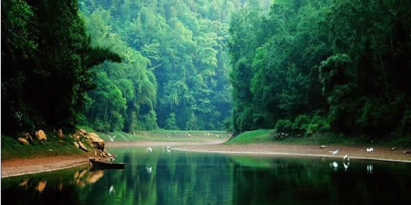 (4)象鼻河 象鼻河位于回龍湖尾段,經(jīng)岳池縣城出發(fā)車行至天平鎮(zhèn)回龍湖坐船可到,河長約四公里。因河端有一小山,形態(tài)奇特,遠(yuǎn)望酷似大象的鼻子,所以這條河就叫象鼻河。象鼻河寬五六丈,象一顆長寶石鑲嵌在兩岸的高巖之間。象鼻河西側(cè)有雞頸坳和庵堂坡相互攀比,各自把山巖泉水盡量拋出。飛瀑直下,銀花四濺,疑是仙人,丟下白練。兩岸樹木,青翠欲滴,藤繞山石,鳥戲其間,蜂飛蝶舞,何等悠然。乘舟慢進(jìn),有山風(fēng)習(xí)習(xí),涼爽撲面。清澈河水,擁抱船板,發(fā)出咕咕細(xì)語,情意綿綿。上游涌來清流,與河水交融,握手言歡。游魚競技,爭先恐后,其樂融融,游人贊嘆。“青山之中藏小河,木船水頭蕩清波。有人興起一聲吼,魚逃鳥飛野兔躲。誰說人間無仙境?不信請來象鼻河。”象鼻河匯入的回龍湖鑲嵌在兩岸直壁芳草如茵的群山之中,這里水面遼闊,一碧如玉;湖上輕舟飛蕩,魚歌陣陣,銀鱗競躍,水鳥爭翔,陰雨時山色空 蒙,晴天里滿目蒼翠,是川東的又一西子湖。湖邊近500畝的名優(yōu)水果和各種反季節(jié)果類,更是錦上添花。