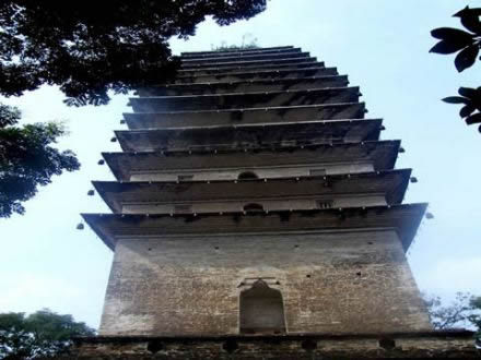 靈寶塔又名凌云塔,因其聳立在凌云寺后的靈寶峰巔,故以山峰命名。塔建于唐代,塔形呈密檐式四方錐體,磚砌而成,坐東向西,高38米,共十三級(jí)。塔體中空,內(nèi)確 ”石階沿塔軸盤(pán)旋至頂。塔頂為四角攢尖式。靈寶塔的結(jié)構(gòu)和風(fēng)格與西安小雁塔相似。