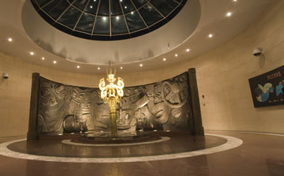 青銅器館以青銅人首鳥身像為主體標(biāo)志性雕塑,輔以大型銅質(zhì)浮雕背屏,通過連續(xù)遞進(jìn)的場(chǎng)景組合,全面系統(tǒng)地展示三星堆的青銅雕像群及一批古蜀青銅神品重器。青銅器館分六個(gè)展廳,分別為:一展廳為“銅鑄幻面,寄載魂靈——奇秘面具”;二展廳為“赫赫諸神,森森群巫——神巫群像”;三展廳為“皇天后土,人神共舞——祭祀大典”;四展廳為“矗立凡間,溝通天地——群巫之長(zhǎng)”;五展廳為“千載蜀魂——奇絕的宗廟神器”;六展廳為“心路歷程——三星堆考古錄”。