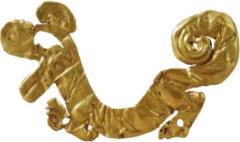 商金箔虎形飾:此文物為商代的金器,系用金箔捶拓成形,遍體壓印“目”字形的虎斑紋。虎頭昂起,張口作咆哮狀,眼部鏤空,前足伸,后足蹲,尾上卷,呈奔跑狀。金虎呈半圓形,F(xiàn)收藏于三星堆博物館。