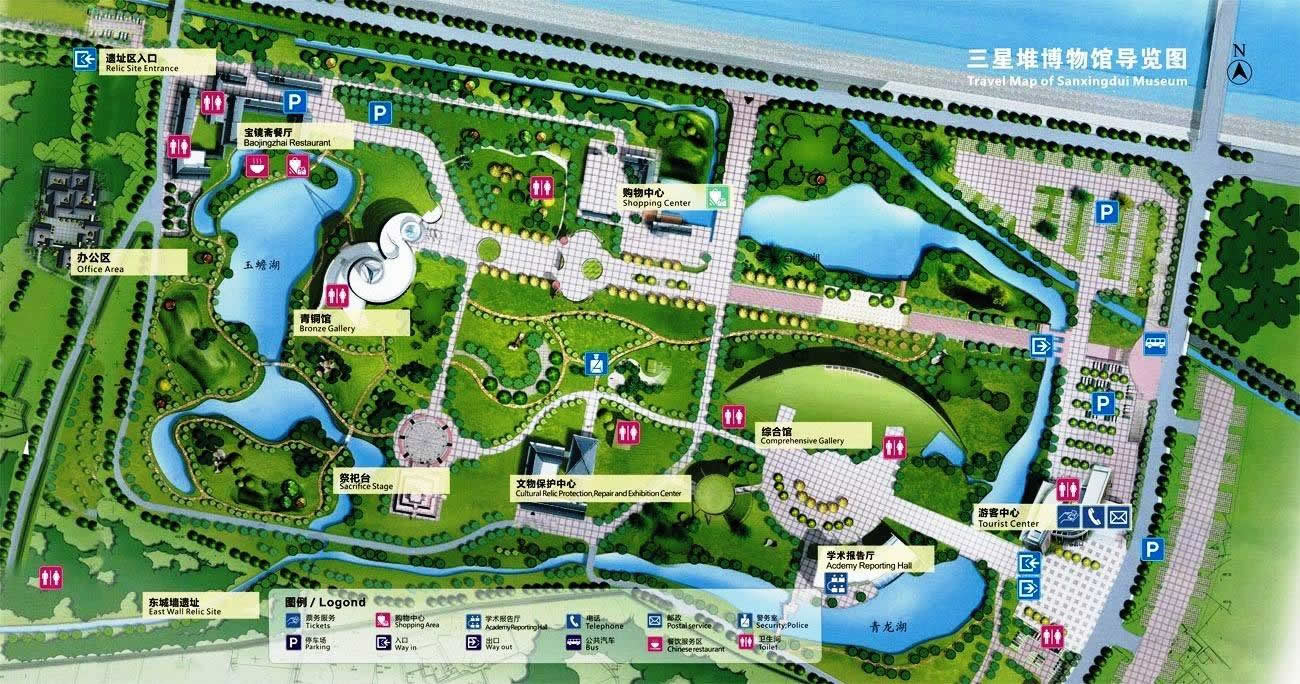 三星堆博物館(Sanxingdui Museum)于1992年8月奠基,1997年10月建成開放,位于全國重點(diǎn)文物保護(hù)單位三星堆遺址東北角,地處廣漢城西鴨子河畔,南距成都40公里,北距德陽26公里,是中國一座現(xiàn)代化的專題性遺址博物館。三星堆博物館有兩個(gè)展館,其展示面積近12000平方米。
