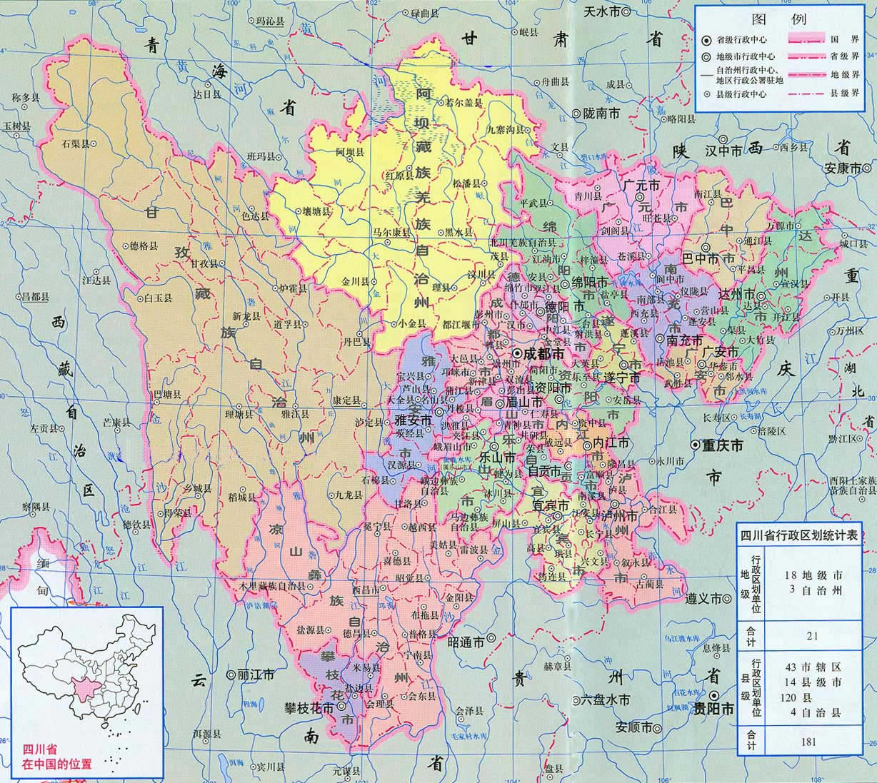 行政區(qū)劃:四川的行政區(qū)劃共有21個(gè)市、地、州, 轄177個(gè)縣(市、區(qū)), 其中有13個(gè)地級(jí)市、5個(gè)地區(qū), 3個(gè)自治州, 18個(gè)縣級(jí)市, 35個(gè)市轄區(qū), 124個(gè)縣, 3個(gè)自治縣。