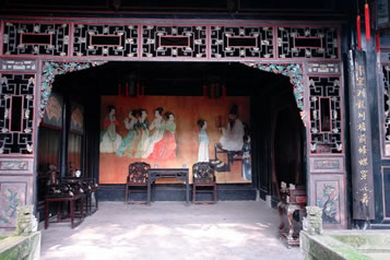 工字廳的正前方有一臺(tái)階。臺(tái)階上方是戲臺(tái)。臺(tái)前立柱上有一副對(duì)聯(lián):“移影換形儼然君臣父子,假哭真笑表達(dá)離合悲歡”,構(gòu)思精妙,立意深刻,無(wú)聲地向人昭示:這里是戲劇的天地。臺(tái)口左右華板上雕刻著《白蛇傳》中的“船舟借傘”和《西廂記中》的“鶯鶯聽(tīng)琴”。人物形神畢現(xiàn),栩栩如生。臺(tái)前的落地罩精致絕倫,有關(guān)專(zhuān)家學(xué)者稱(chēng)贊其“集中國(guó)民間傳統(tǒng)木雕之精華”,自是當(dāng)之無(wú)愧,其雕刻內(nèi)容,有歷史故事,如“黃道州發(fā)兵抗清”;有戲劇故事,如“別窯從軍”;有的取材于唐詩(shī),如“尋隱者不遇”、“清明詩(shī)”等,有民間傳說(shuō),如“羊有跪乳之恩、烏有反哺之義”;有的采用諧音、象征手法表現(xiàn)美好的意愿的傳統(tǒng)圖案,如“掛印封候”、“富貴白頭”、“路路通順”等。