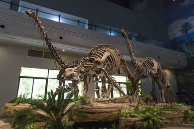 1.藏量巨大。館藏恐龍及魚類、兩棲類、龜鱉類、蛇頸龍類、鱷類等個體200多具。其中恐龍種類包括原蜥腳類、蜥腳類、獸腳類、鳥腳類和劍龍類等,數(shù)量占全川總數(shù)的1/2,占全國總數(shù)1/6,是名副其實的全國第一大恐龍冢穴,在國際上與之齊名的也僅有美國猶他州國立恐龍紀(jì)念館和加拿大阿爾伯塔省立恐龍公園。