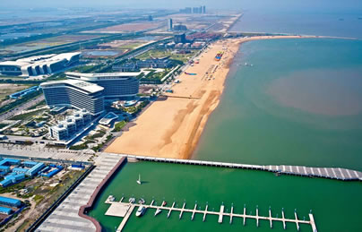 東疆港人工沙灘(東疆灣金沙灘)—天津?yàn)I海新區(qū)首個(gè)人工海灘已經(jīng)建成,藍(lán)色的海水,金色的沙灘,或坐在松軟沙灘上吹海風(fēng),或光著腳丫在鵝卵石帶上散步,撿貝殼、吃燒烤、玩沙灘排球……您用不著走出天津,就能享受“碧海金沙”帶來(lái)的樂(lè)趣。東疆港人工沙灘所處的位置是天津海岸線最靠近外海,也是水質(zhì)最好的地方。東疆港人工沙灘的“金沙”平均厚度達(dá)1.2米,從岸邊呈緩坡?tīng)钜恢毖由熘梁_。人工沙灘所用的“金沙”全部從福建運(yùn)來(lái),用量近20萬(wàn)噸。沙灘的緩坡設(shè)計(jì)充分考慮到潮水漲落時(shí)的水流情況,可防止海水退潮時(shí)將“金沙”帶走。為保證游人安全,在公共游樂(lè)區(qū)沙灘的近海端鋪設(shè)了一條寬約58米的鵝卵石帶,所用鵝卵石將從秦皇島運(yùn)來(lái)。此外,天津港還在附近海域修建防波堤,以保持海灘的潔凈,防止海上漂浮物進(jìn)入人工海灘。