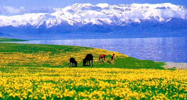 賽里木湖古稱“凈!,位于中國新疆博爾塔拉州博樂市境內(nèi)的西天山山脈中,緊鄰伊犁州霍城縣,是一個風(fēng)光秀美的高山湖泊。賽里木湖湖面海拔2073米,水深85公尺,東西長約30公里,南北寬約25公里,周長90公里,水域面積460平方公里,是新疆海拔最高、面積最大的高山冷水湖。 [16]賽里木湖蒙語稱“賽里木淖爾”,意為“山脊梁上的湖”,面積約458平方公里,水質(zhì)透明度達10—12米。