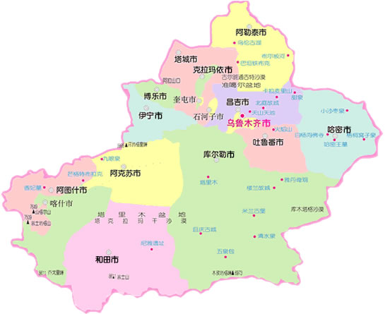烏魯木齊市 | 克拉瑪依市 | 吐魯番市 | 哈密市 | 和田地區(qū) | 阿克蘇地區(qū) | 喀什地區(qū) | 塔城地區(qū) | 阿勒泰地區(qū)