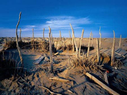 羅布泊干涸后,周圍生態(tài)環(huán)境發(fā)生巨變,草本植物全部枯死,防沙衛(wèi)士胡楊樹成片死亡,沙漠以每年3~5米的速度向羅布泊推進,很快和廣闊無垠的塔克拉瑪干沙漠融為一體。羅布泊從此成了寸草不生的地方,被稱作“死亡之海”。