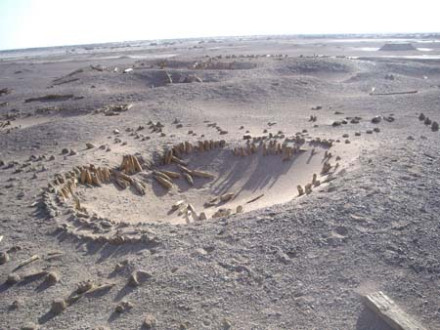 位于太陽墓地西側(cè),在古河道北岸的一片臺地上,有成片的株距相等、行距相同、樹干尺余粗的枯死的胡楊林。這成排成行的枯樹,帶有明顯的人工營造的特征。