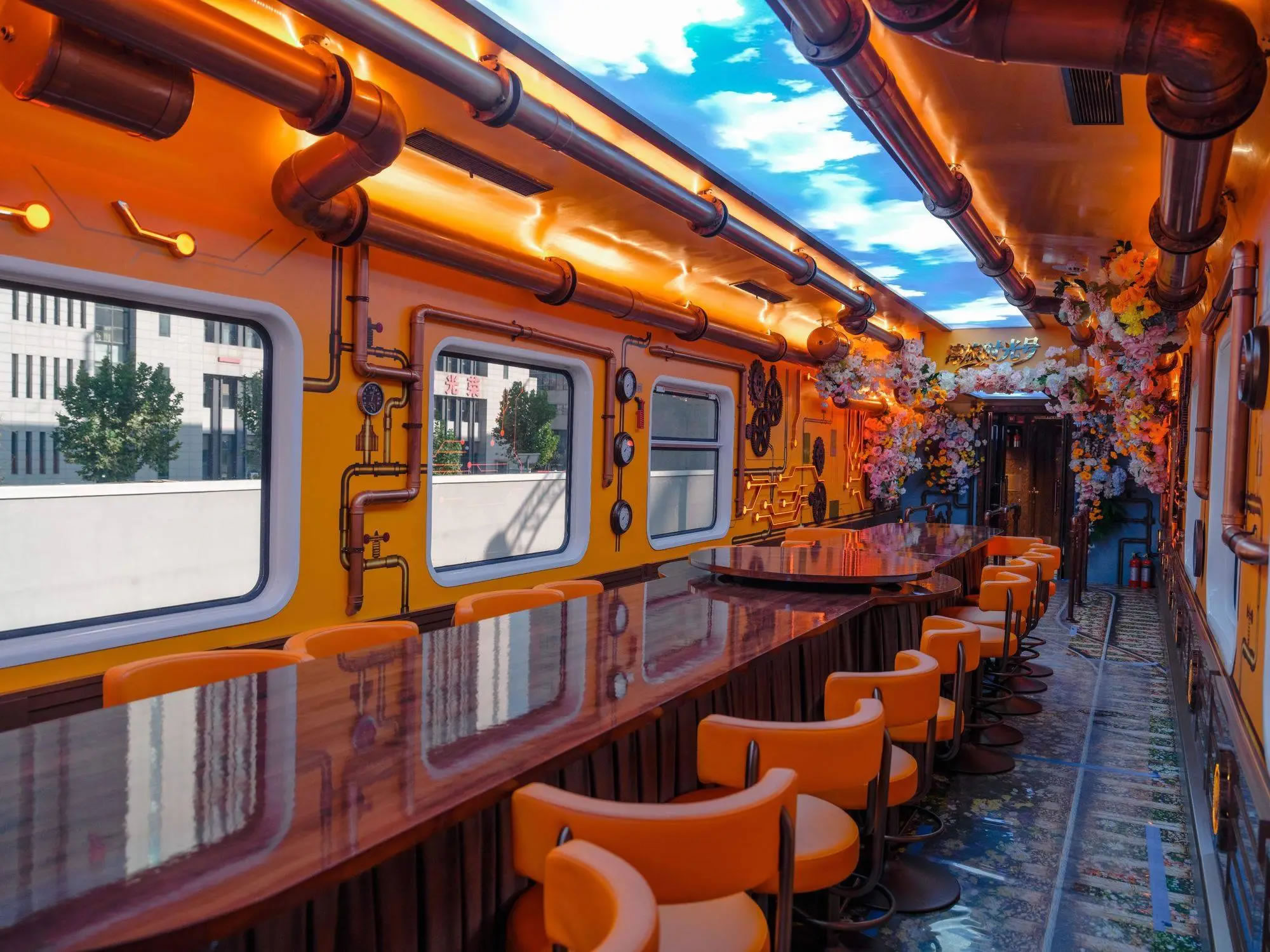 列車共設(shè)10節(jié)主題鮮明的特色車廂:分別為復(fù)古客座車廂、蒙太奇幻境互動演藝車廂、珍奇花園俱樂部車廂、沉浸式時空穿梭機車廂以及專屬VIP車廂,均以沉浸式戲劇化空間為理念,將座椅拆分重組,每節(jié)車廂形成互動或演藝區(qū),配備移動舞臺、隱藏?zé)糗壓铜h(huán)繞音響。座椅、地面及軟裝材料兼顧安全與舒適,同時配備冷暖氣系統(tǒng)、移動吧臺和多功能儲物柜,提供全方位的互動體驗。