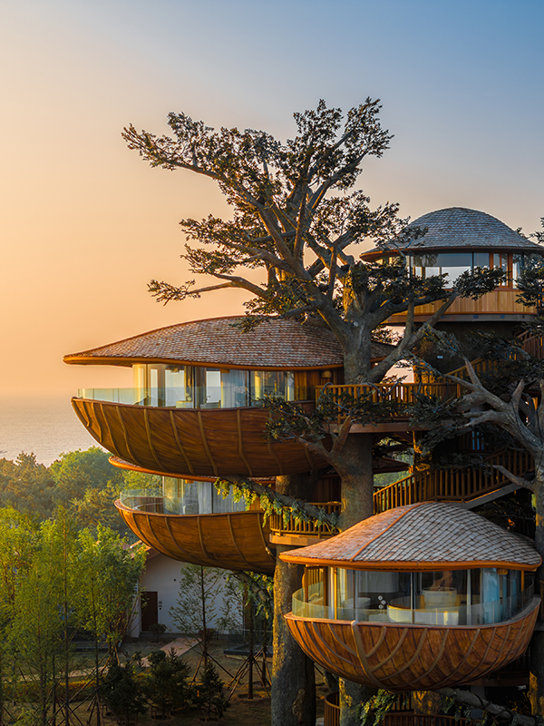 架空設(shè)計(jì)的海螺屋客房隱于林間,如同童話故事中的精靈居所,為住客營(yíng)造出私密而夢(mèng)幻的休憩空間;天文臺(tái)客房懸于巖壁之上,通過客廳的望遠(yuǎn)鏡和全景天窗可賞星河美景,將浩瀚星空引入室內(nèi);炭晶舍客房以傳統(tǒng)炭雕藝術(shù)為靈感,通體的炭黑色藝術(shù)感十足,展現(xiàn)出材料與自然的深度對(duì)話;復(fù)式結(jié)構(gòu)的玉江舍客房,則讓賓客在空間轉(zhuǎn)換中,收獲山川、江潮等不同的觀景視野,實(shí)現(xiàn)移步換景的居住意境。