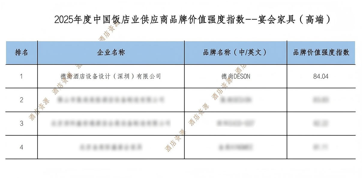 《2025年度中國飯店業(yè)供應(yīng)鏈品牌價(jià)值強(qiáng)度報(bào)告》由全聯(lián)旅游業(yè)商會(huì)住宿業(yè)分會(huì)聯(lián)合多家權(quán)威機(jī)構(gòu)共同編制,已成為酒店采購決策的重要參考依據(jù)。DESON德尚能夠?qū)崿F(xiàn)行業(yè)榜首的蟬聯(lián),關(guān)鍵在于其核心業(yè)務(wù)方向與酒店業(yè)發(fā)展訴求形成深度契合。