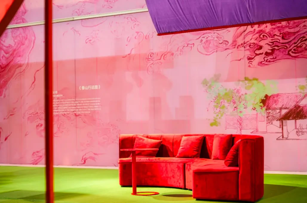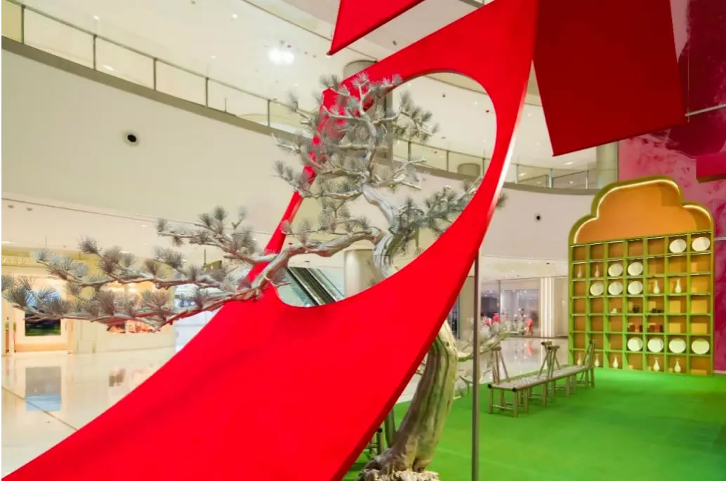 山水,并非遠(yuǎn)行才可得見(jiàn)。書法水墨藝術(shù)家劉玥首展作品《春山行遠(yuǎn)圖》以20米巨幅“山水開(kāi)卷”,步入其中,與天地春意從容照面;紅色的帷幔落于銀色的松枝上,就像于山間松下靜謐的一隅,“幕下棲心”將是絕佳開(kāi)年時(shí)尚大片的打卡處;松下銀椅,為你與摯友“漫敘往來(lái)”的相聚時(shí)刻營(yíng)造出寧?kù)o、松弛的氛圍;多寶閣中陳列著未經(jīng)雕琢的茶器素胚與場(chǎng)內(nèi)品牌萬(wàn)仟堂,長(zhǎng)沙尼依格羅酒店及tea'stone帶來(lái)的新春茶器,以“初芒蘊(yùn)能”詮釋著未來(lái)的無(wú)限可能與新生力量。轉(zhuǎn)身與“蒔光種愿” 四方亭相遇。葫蘆門朝四方而開(kāi),寓意著納四方福祿,步入其中,與數(shù)字交互藝術(shù)家吳旭首展作品《無(wú)限福祿》體驗(yàn)互動(dòng),跟隨指引揮動(dòng)手勢(shì),觸發(fā)粒子凝聚為動(dòng)態(tài)“福”字,親手完成一場(chǎng)新春祈福儀式。我們把象征團(tuán)圓與喜悅的紅色沙發(fā)打造“盞間聚暖”,如懷抱般圍合的布局作為“歸處”的隱喻。與家人團(tuán)聚便是心歸處,這將是中國(guó)年最圓滿的意象。