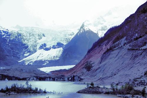 離開(kāi)川藏公路,過(guò)了新建的橫跨額公藏布江公路橋后,只見(jiàn)一條兩面均是懸崖絕壁的峽谷,沿著小河修建的村道僅能通過(guò)一輛車,再走幾公里后,突然出現(xiàn)大片寬闊的谷地,遠(yuǎn)處兩條壯觀的冰瀑布掛在雪峰與森林之間,猶如兩道由天而下的巨大銀幕……要與米堆冰川做近距離接觸的話,還要徒步走進(jìn)層林盡染的森林,翻越三道冰川運(yùn)動(dòng)留下的終磧垅。當(dāng)走上第三個(gè)終磧垅時(shí),一個(gè)冰湖出現(xiàn)。冰湖的另一端有一道寬近兩米、高達(dá)十?dāng)?shù)米的斷裂的冰舌,發(fā)出幽幽的藍(lán)光。從天而下的冰瀑布在陽(yáng)光下閃著銀色的光芒,近800米的落差讓人感到一陣暈眩。一陣陣從冰川上吹來(lái)的寒風(fēng)迎臉撲來(lái),在強(qiáng)烈的陽(yáng)光下,還是讓人不寒而栗。