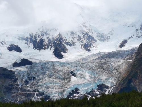 該冰川常年雪光閃耀,景色神奇迷人。這是典型的現(xiàn)代季風(fēng)型溫性冰川,類型齊全,尤以巨大的冰盆、眾多雪崩、陡峭巨大700-800米的冰瀑布、消融區(qū)上游的冰面弧拱構(gòu)造以及冰川末端冰湖和農(nóng)田、村莊共存為特點(diǎn)。
