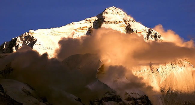 珠穆朗瑪峰地區(qū)及其附近高峰的氣候復雜多變,即使在一天之內(nèi),也往往變化莫測。大體來說,每年6月初至9月中旬為雨季,強烈的東南季風造成暴雨頻繁,云霧彌漫,冰雪肆虐無常的惡劣氣候。11月中旬至翌年2月中旬,因受強勁的西北寒流控制,最低氣溫可達-50℃,平均氣溫在-30℃左右。最大風速可達90米/秒。每年3月初至5月末是風季過渡至雨季的春季,而9月初至10月末是雨季過渡至風季的秋季,在這兩個季節(jié)期間,有可能出現(xiàn)較好的天氣。