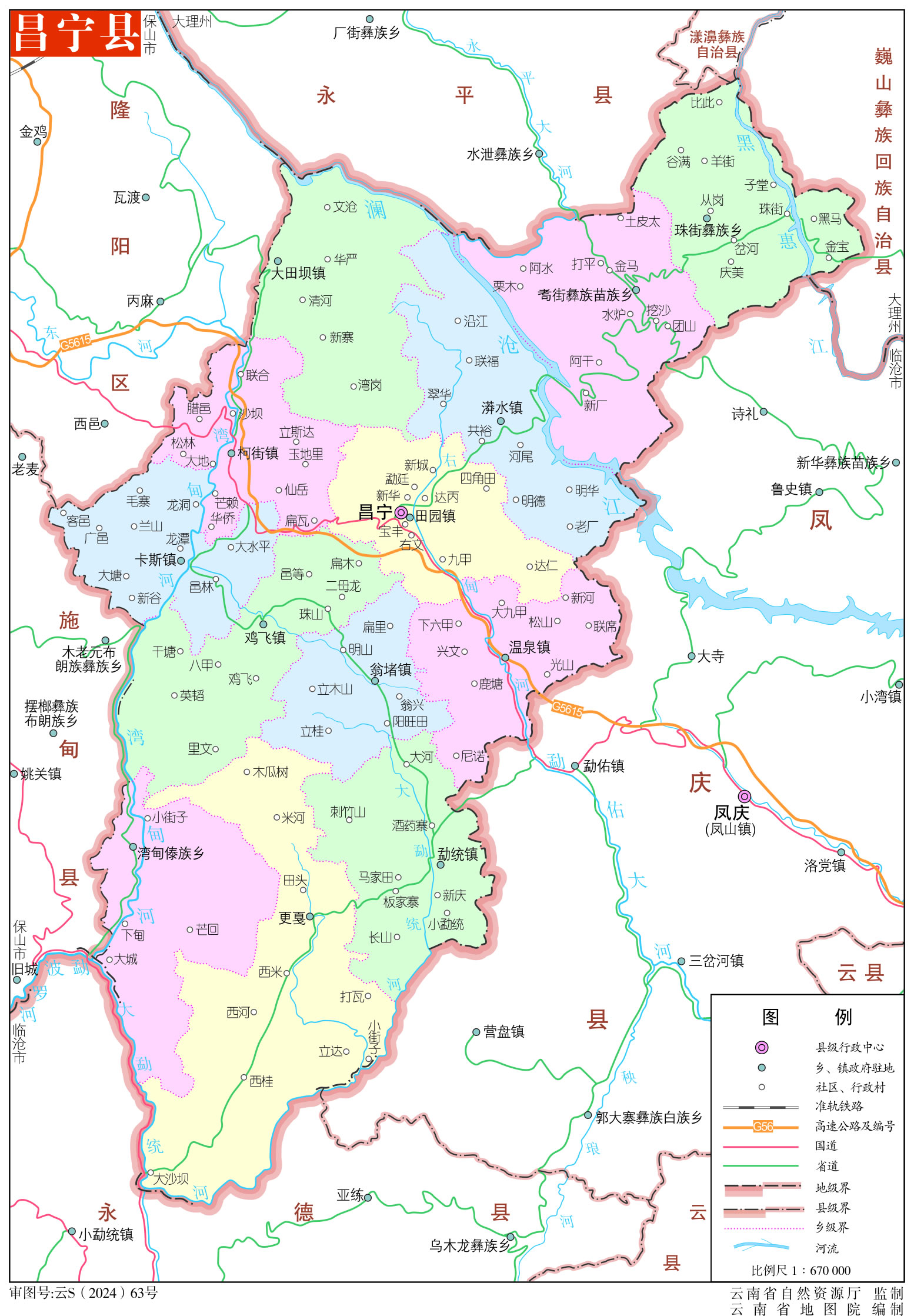 位置境域 昌寧縣云南省西部,東連鳳慶縣,西接隆陽區(qū)、施甸縣,南與永德縣隔河相望,北鄰永平縣、漾濞彝族自治縣、巍山彝族回族自治縣,總面積3888平方公里。