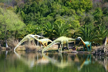 由“侏羅紀(jì)大瀑布”、“群龍對(duì)峙”、“腕龍相親”、“氣龍追逐”、“雙龍飲瀑”、“霸王龍窺獵”、“侏羅紀(jì)叢林”、“海棗之王”、“沙漠之林”等九大景觀真實(shí)再現(xiàn)了侏羅紀(jì)時(shí)代恐龍王國的生活場(chǎng)景,構(gòu)造出一個(gè)1億年前生氣勃勃、繁榮昌盛的侏羅紀(jì)世界,讓游客飽享一頓視覺大餐。