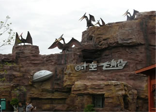 時(shí)空飛船:在一個(gè)不起眼的洞窟崖壁上有一架墜毀的飛船。進(jìn)入洞窟是一座神秘的飛船發(fā)射基地,從這里就是游客將乘坐“時(shí)空飛船”飛越侏羅紀(jì)。飛船會(huì)進(jìn)入神秘的時(shí)光隧道,游客將親歷地球生命演變和進(jìn)化的過程,在短短10分鐘內(nèi)走完地球生命幾十億年的演化歷程,最后進(jìn)入到侏羅紀(jì)世界。