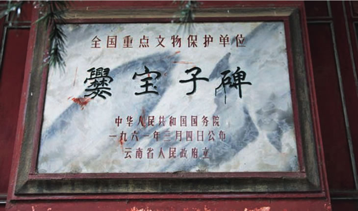在越州楊旗出土的爨寶子碑全稱(chēng)為“晉故振威將軍建寧太守爨府君墓”碑,立于東晉大亨四年(公元405年)!鹅鄬氉颖肥请`書(shū)向楷書(shū)過(guò)渡的典型碑刻;碑文通篇為六朝時(shí)期的駢文體;也是研究南北朝時(shí)期云南地方史不可多得史料。1961年,國(guó)務(wù)院將其公布為第一批全國(guó)重點(diǎn)文物保護(hù)單位。存于曲靖一中。
