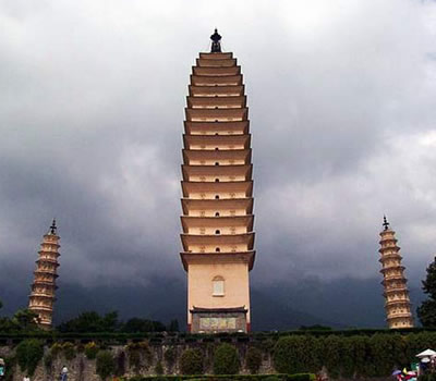 三塔相傳建于南詔保和時(shí)期,三塔之旁原有規(guī)模宏大的崇圣寺。據(jù)《南詔野史》、《自古通記》等史籍記載,寺基方7里,建于南詔第十主豐佑,保和十年至天啟元年(公元834至840年)。經(jīng)歷了千年滄桑和風(fēng)雨剝蝕,崇圣寺終毀于清咸豐年間,如今惟留三塔。近年來(lái)曾在塔頂發(fā)現(xiàn)南詔、大理中時(shí)期的重要文物600余件。