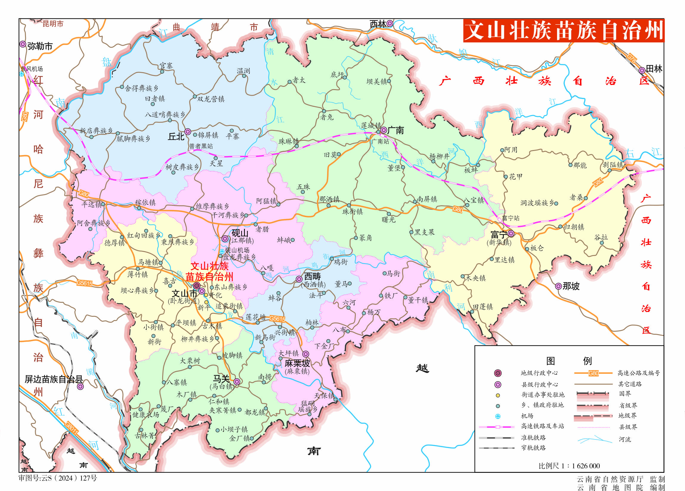 文山壯族苗族自治州轄1個縣級市、7個縣: