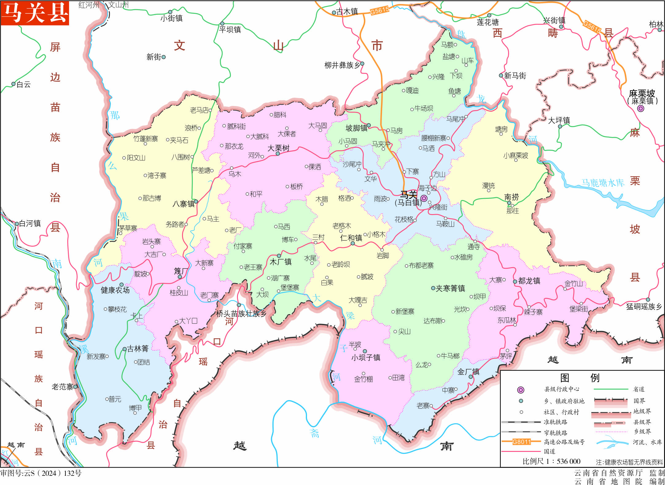 鎮(zhèn):馬白鎮(zhèn)、坡腳鎮(zhèn)、八寨鎮(zhèn)、仁和鎮(zhèn)、木廠鎮(zhèn)、夾寒箐鎮(zhèn)、小壩子鎮(zhèn)、都龍鎮(zhèn)、金廠鎮(zhèn)