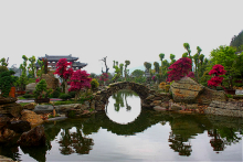 地處根宮佛國文化旅游區(qū)山麓,緊依根雕佛國,有醉松亭、日月亭、回思廊、靜心亭、樂禽園等景觀建筑,陳列有以松柏類為主的盆景藝術(shù)作品1500余盆,造型博采眾長,創(chuàng)意自然,有小橋流水田舍人家的水旱盆景,有濃縮華山天險附石盆景,有的以石為盆回歸自然,有的三五成林意境高遠,大自然的千奇百怪,于方寸間一覽無余,具有空中花園美譽。
