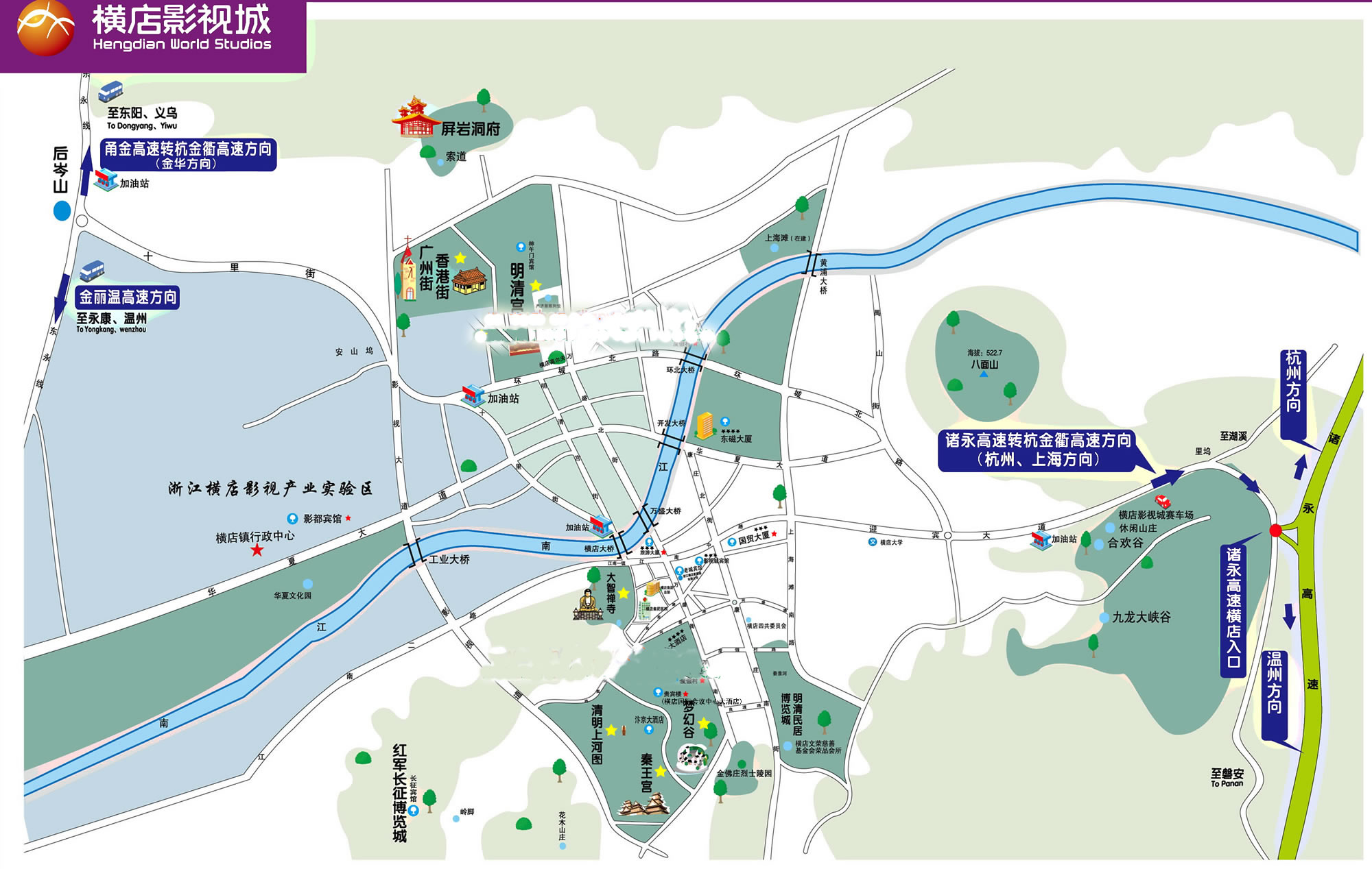 江西方向:梨溫高速—杭金衢高速—甬金高速,東陽(yáng)出口下,抵橫店