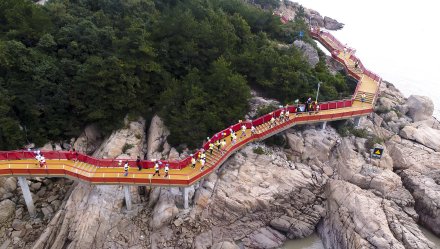 松蘭山游步道位于松蘭山沿海岸線,南起東沙灘,北至白沙灣,以棧道形式沿濱海礁石海灘穿行,全長(zhǎng)3.1公里,平均寬度為2.5米,總面積約12萬(wàn)平方米。棧道是集公眾性、休閑性、生態(tài)性為一體的高品質(zhì)濱海慢行步道,沿線設(shè)置濱海眺臺(tái)、觀景平臺(tái)等,全程以紅色為主調(diào),素有“海上紅絲帶”之美譽(yù)。