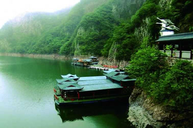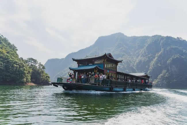 由紫藤長廊拾階登上壩頂,眼前展現(xiàn)的是一湖靜水,綠水蕩漾,深不可測。 水面上疾駛的游船,不時激起層層漣漪,把兩岸的元寶峰,鷲鷹峰,仙桃峰、杜鵑峰、老僧峰、仙掌峰等山峰的倒影彎折。 泛舟湖上,水鳥在水面低飛,狹長的湖面見不到盡頭,大有“青山綠水景無盡”之感,又有“一折青山一扇屏,一彎綠水一古琴”的詩意。沿湖兩邊,蔥蘢俊秀,美不勝收。春天萬木崢嶸,紅杜鵑從綠樹叢中透出;夏天滿山蔥郁,濃蔭蔽日;一到秋冬季節(jié),蒼黃的銀杏葉和紅艷的楓葉,點綴在一片蕭瑟之中。
