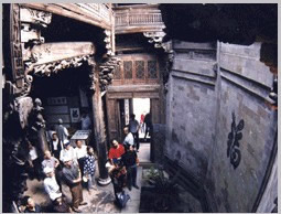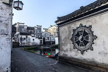 鐘池四周伸展出八條小巷,特點(diǎn)各個不同,形成了坎、艮、震、巽、離、坤、兌、乾八個部位。大公堂就在它的坎宮部位,從它的正門邊上東而去的一條十分幽深,一層層的臺階上坡,左側(cè)是綠蔭如蓋的園子,的一右側(cè)是一排排住宅的后墻,這條巷是通往村中十八廳堂之一的積慶堂的。鐘池東面條巷子很平直,100米長。八條小巷似通卻閉,似連卻斷,虛虛實(shí)實(shí),猶如一張蜘蛛網(wǎng),又宛如一座迷宮。